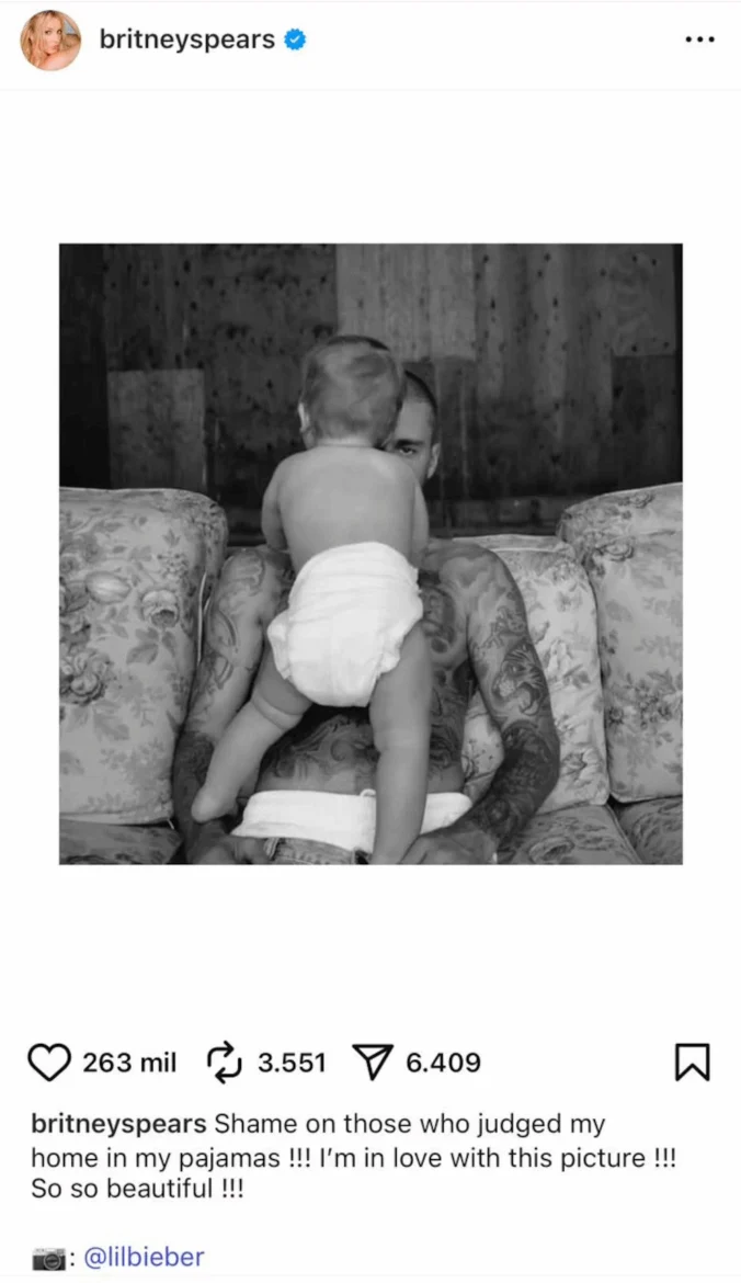 El canadiense compartió varias imágenes en Instagram en las que aparece con Jack de espaldas, protegiendo su rostro, práctica habitual para preservar su intimidad. Spears compartió una de estas fotos en blanco y negro y comentó: